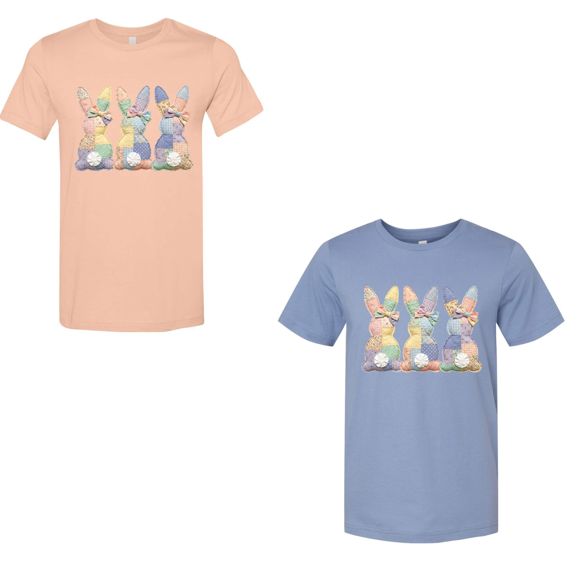 Patchwork bunnies tee available in peach or lavender blue colors. Unisex fit